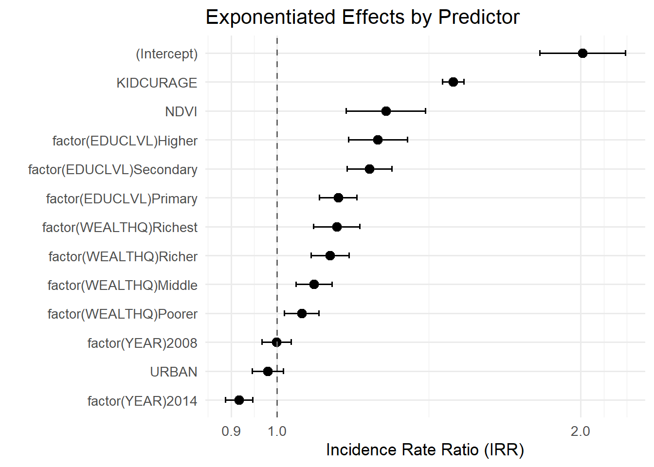 #NDVI ranges between 0 and 1summary(dhs_ndvi$NDVI)#> Min. 1st Qu. Median Mean 3rd Qu. Max. #> 0.06704 0.39064 0.56565 0.52987 0.67642 0.84518#Exponentiating the increment in NDVI by 0.1 instead of 1exp(fixef(multilevel_model2)["NDVI"]*0.1)#> NDVI #> 1.025122
